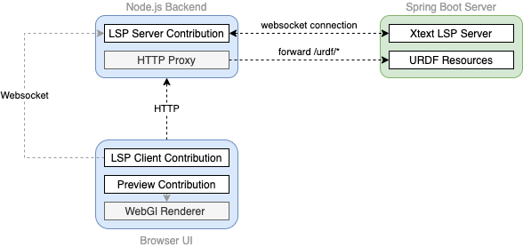 To avoid CORS problems and for simplicity reasons, the UI sends all requests to a single Theia backend. The HTTP-Proxy component forwards all requests under a certain domain to the Java backend. Communication between LSP server implementation and LSP server contribution is achieved using web-sockets. If you are interested in HTTP proxy forwarding and LSP web-socket connection, both are implemented in this class.